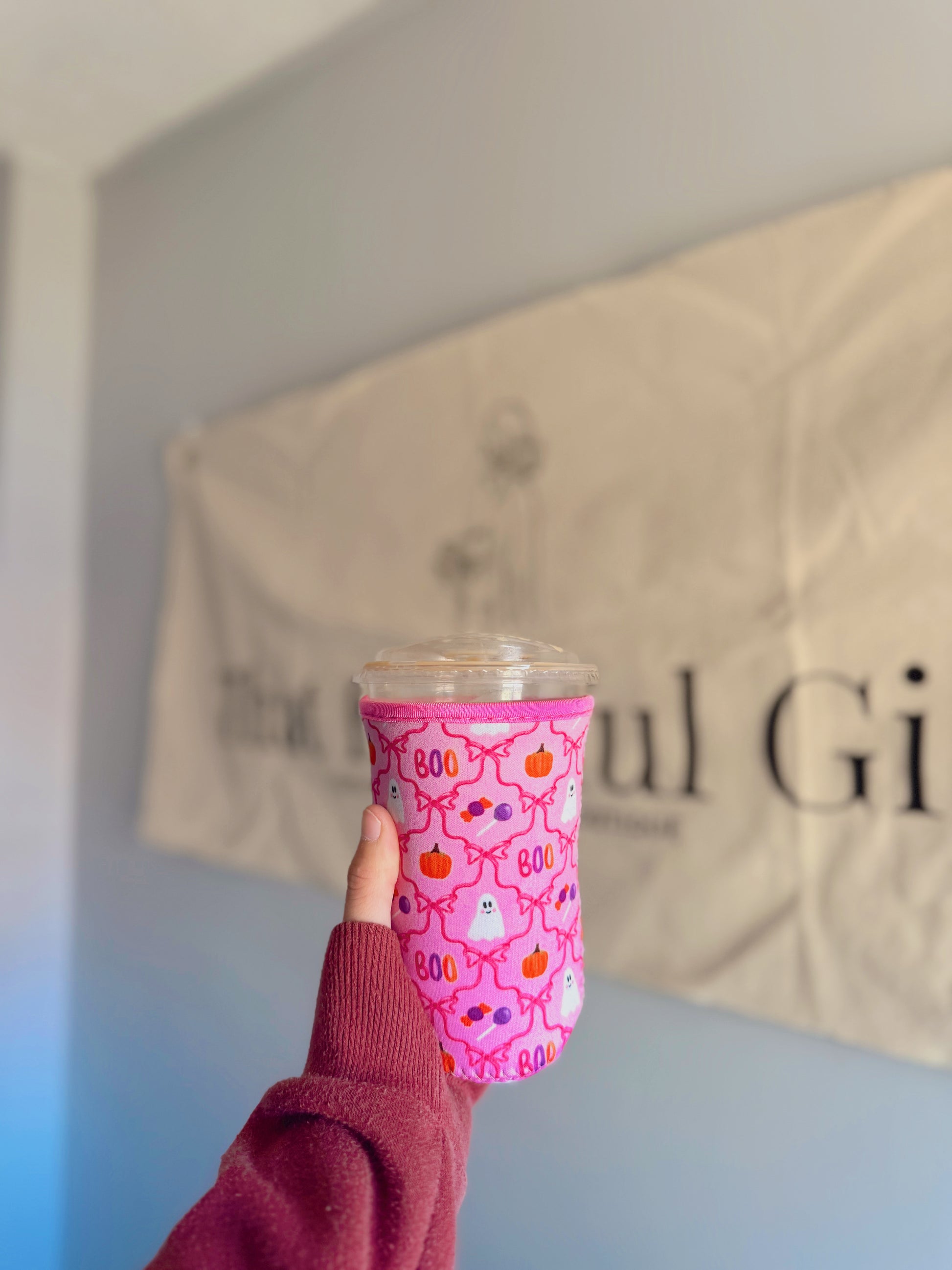 Sip in style with our reusable coffee sleeve. The perfect accessory for your daily brew! Designed to keep your drink warm and your hands cool, this sleeve adds a touch of personality to every cup. Made with durable, soft material that fits most standard coffee cups. Majority of designs come in 3 sizes (32oz, 22-24oz, & 16-18oz) and coffee used in photos is a 16oz.