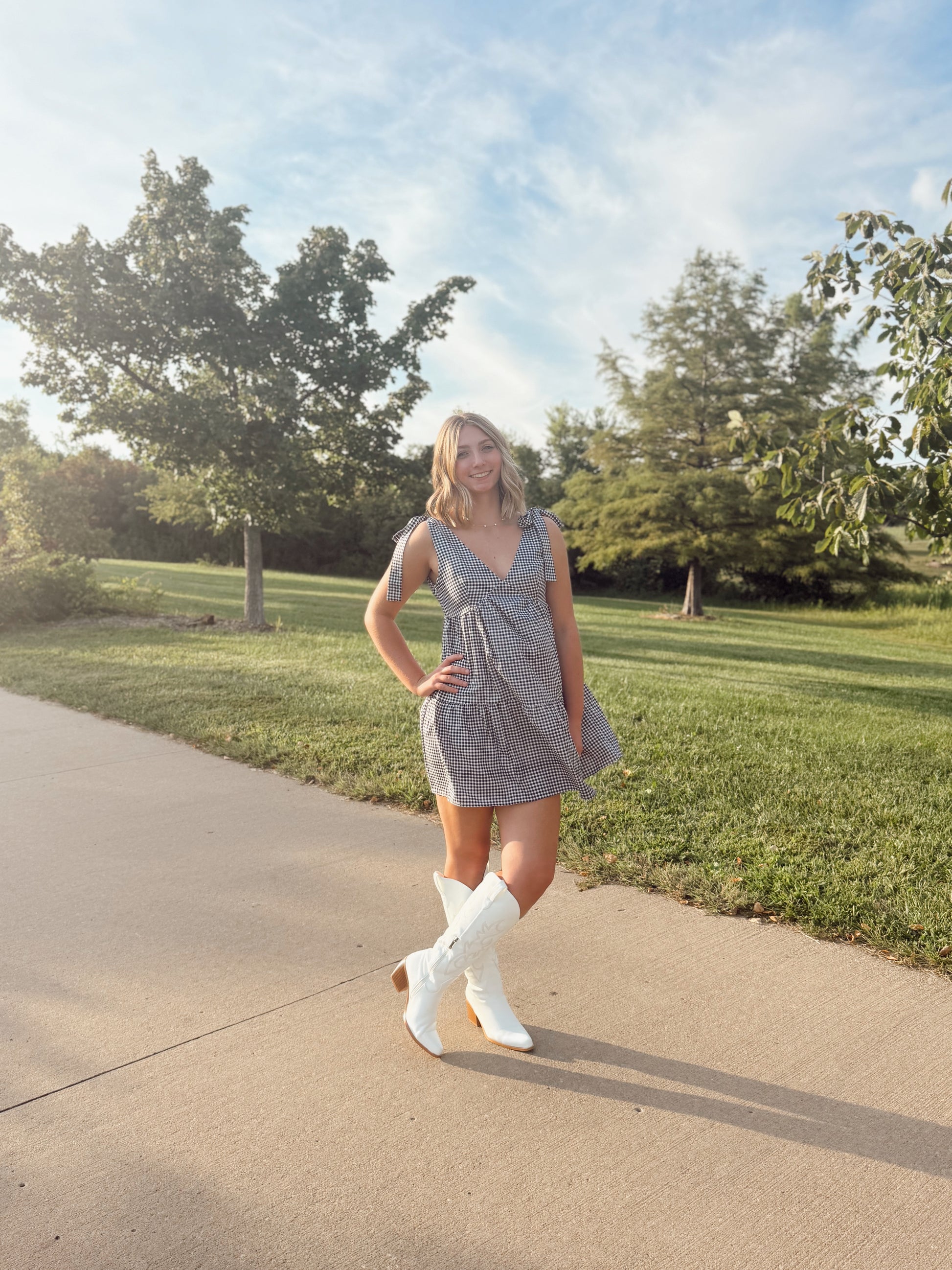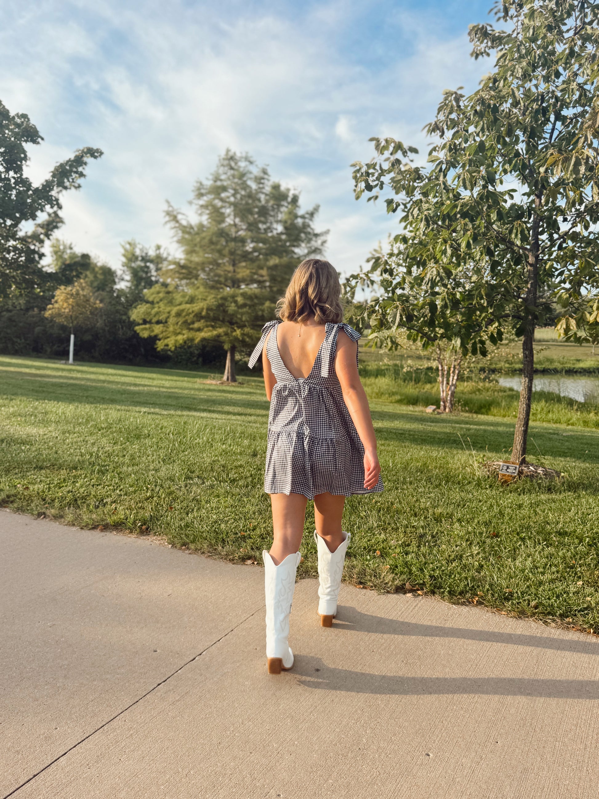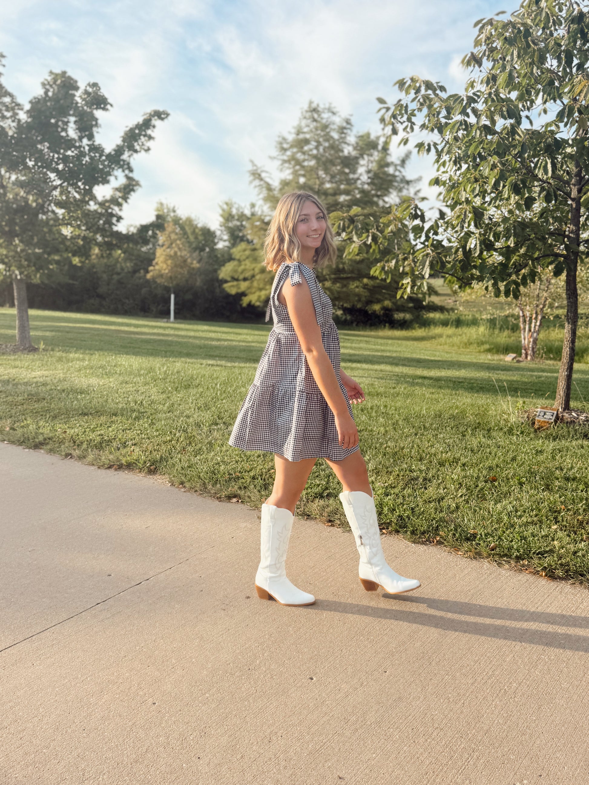 Turn heads on game day in our Victory Bow Dress. Featuring a bold black and white checkered print and a statement bow strap detail. This dress is playful yet chic perfect for showing off your team spirit in style. The lightweight, flattering fit makes it easy to dress up with heels or keep casual with sneakers. Giving you game day confidence from kickoff to victory.